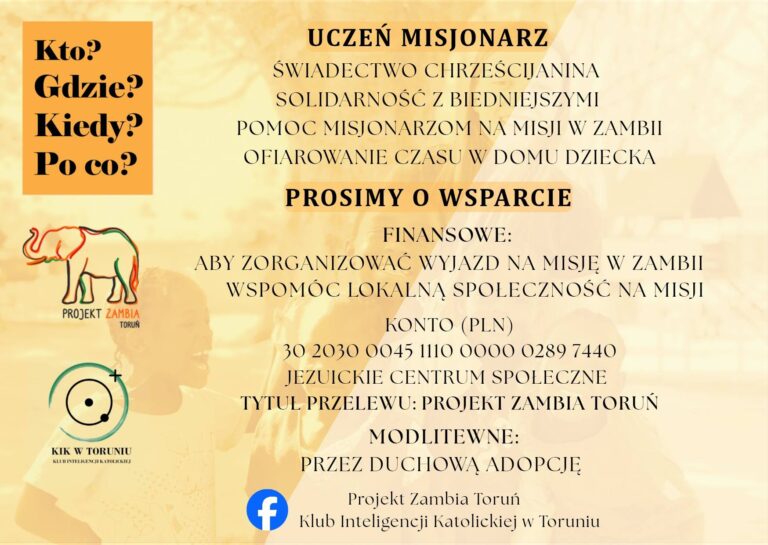 gru 5, 2025Prosimy, jeśli możesz, wesprzyj kwestę na rzecz misji jezuickiej w Zambii. Jutro po każdej mszy świętej w Kościele Akademickim w…