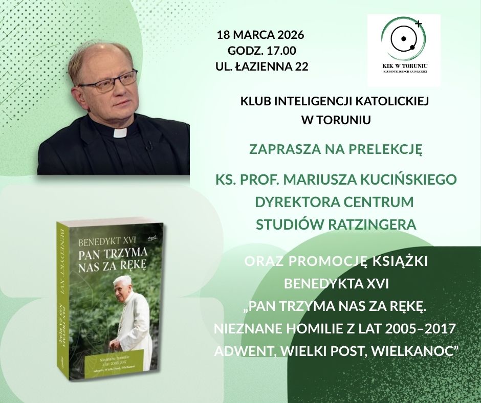 Zapraszam na spotkanie z ks. profesorem Mariuszem Kucińskim – dyrektorem Centrum Studiów Ratzingera, który poza prezentacją cennej publikacji, przybliży osobę profesora Józefa Ratzingera, późniejszego papieża Benedykta XVI. Zachęcamy do wysłuchania prelekcji, dyskusji i lektury.